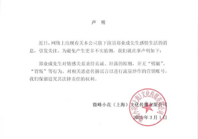 3月1日,郑业成被曝疑似劈叉,此事敏捷激发热365bet登录议。随后,郑188金宝搏业成任务室宣布申明回应,表现郑业成在情感关联中始终秉持真挚跟开阔的准则,否定有关“劈叉”跟“背离”的风闻,并将对歹意传布谎言者保存查究执法义务的权力。